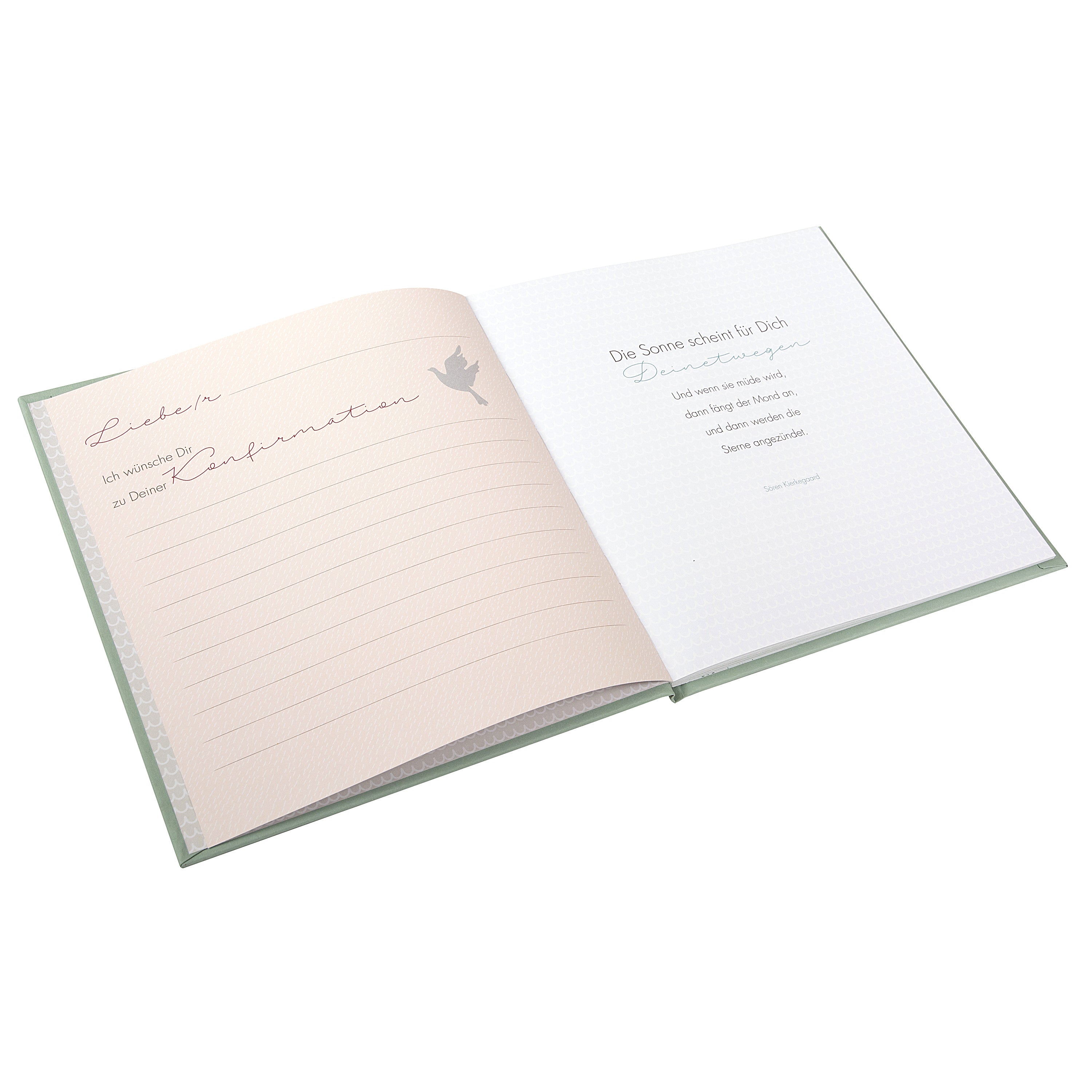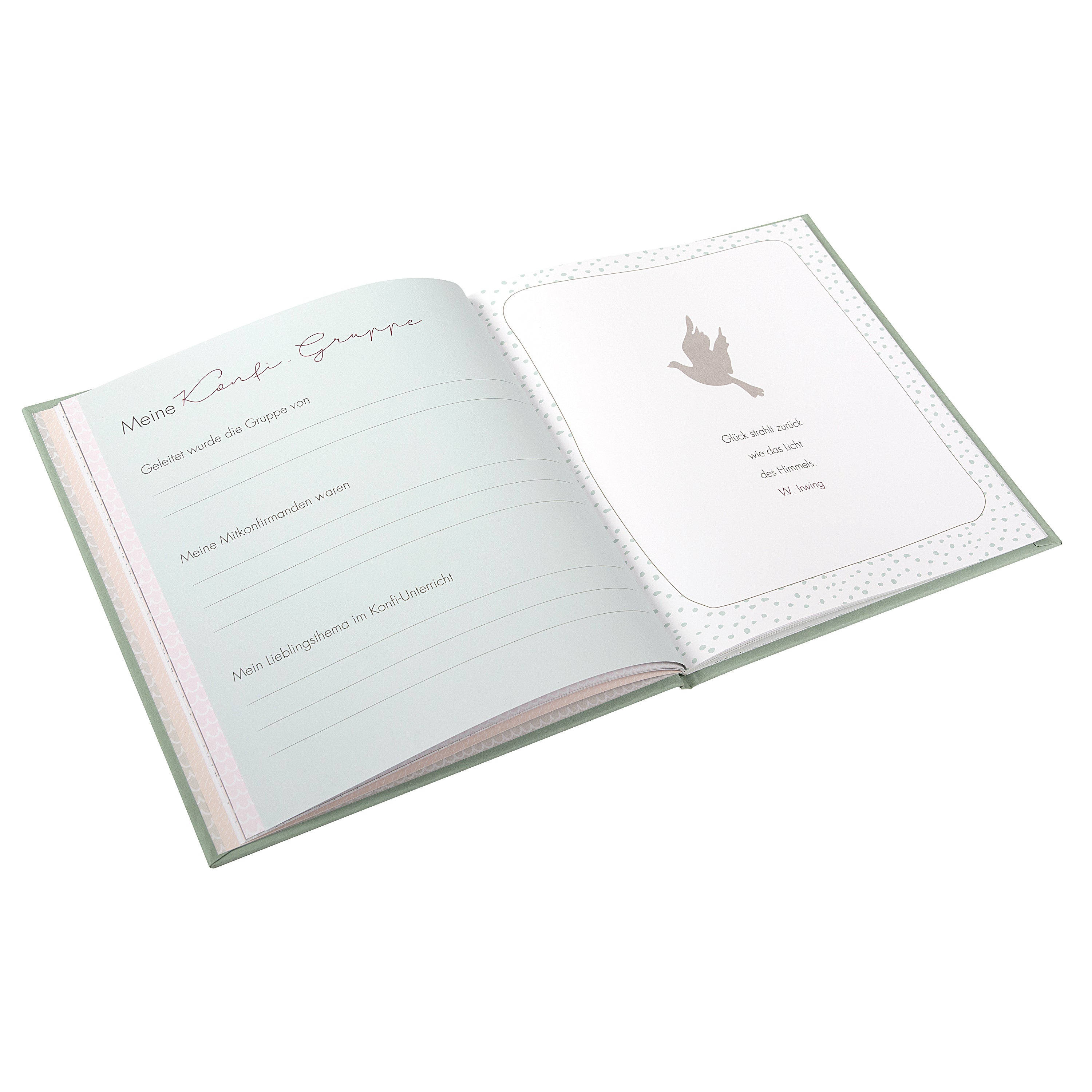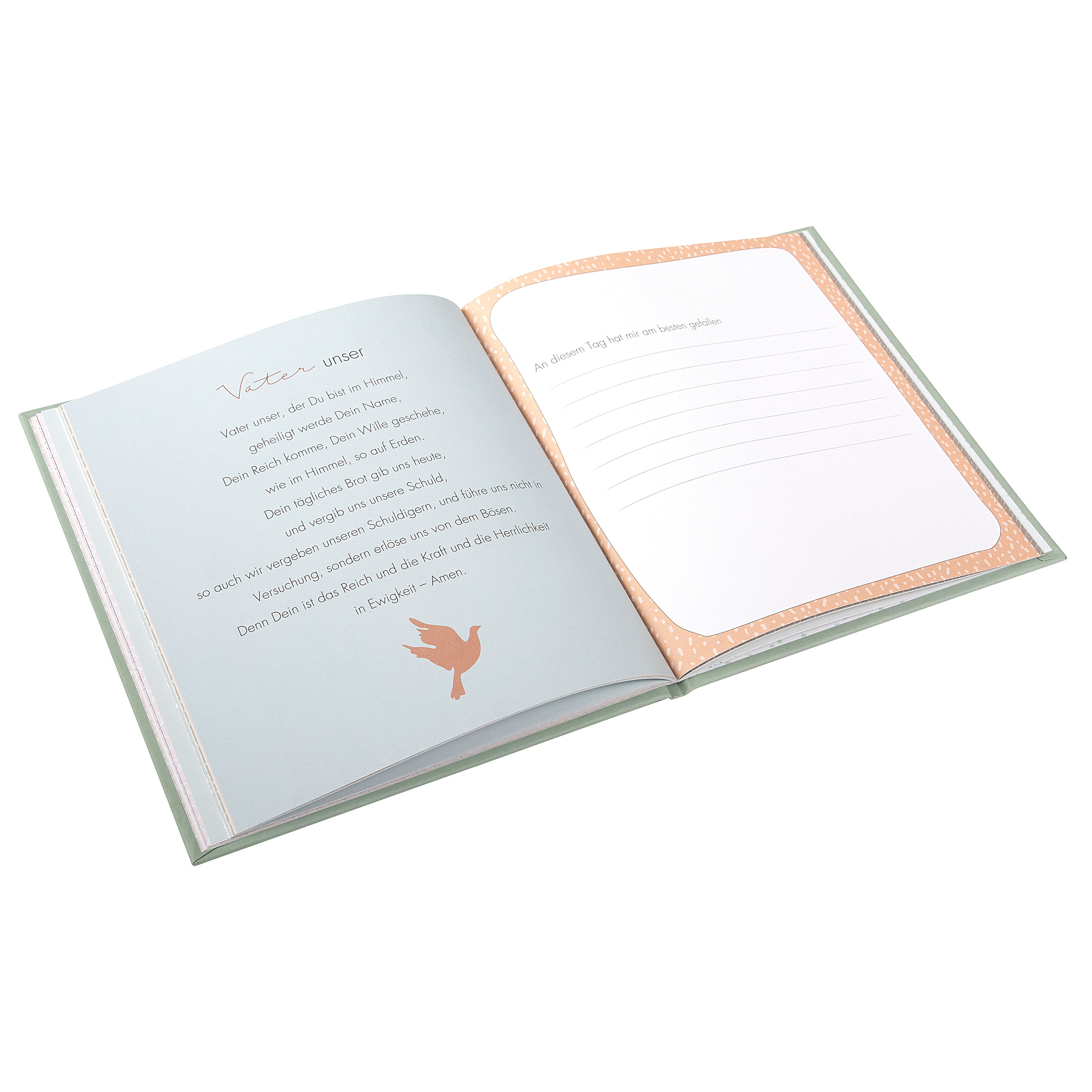 Der Einband in sanftem Eukalyptus-Grün wirkt zeitlos und edel zugleich. Die fein gezeichnete Friedenstaube auf dem Cover steht für Segen, Hoffnung und Gottes Begleitung – ein schönes Symbol, das das Album zu einem ganz persönlichen Glaubensbegleiter macht.