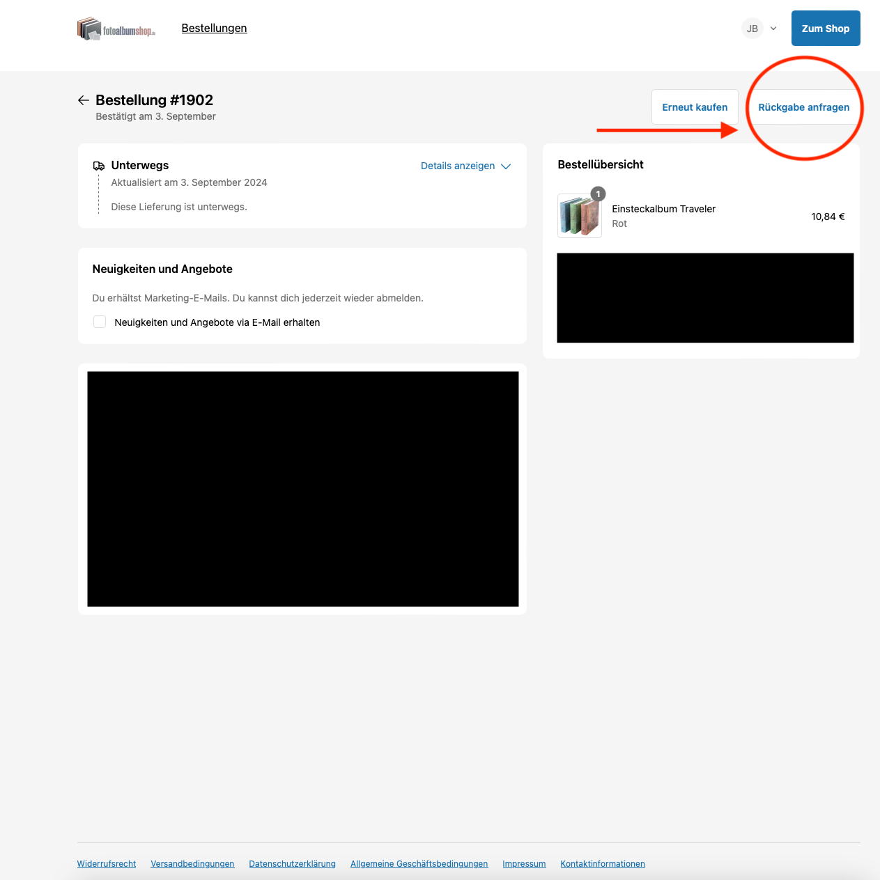 Bestellung auswählen und Rückgabe anfragen