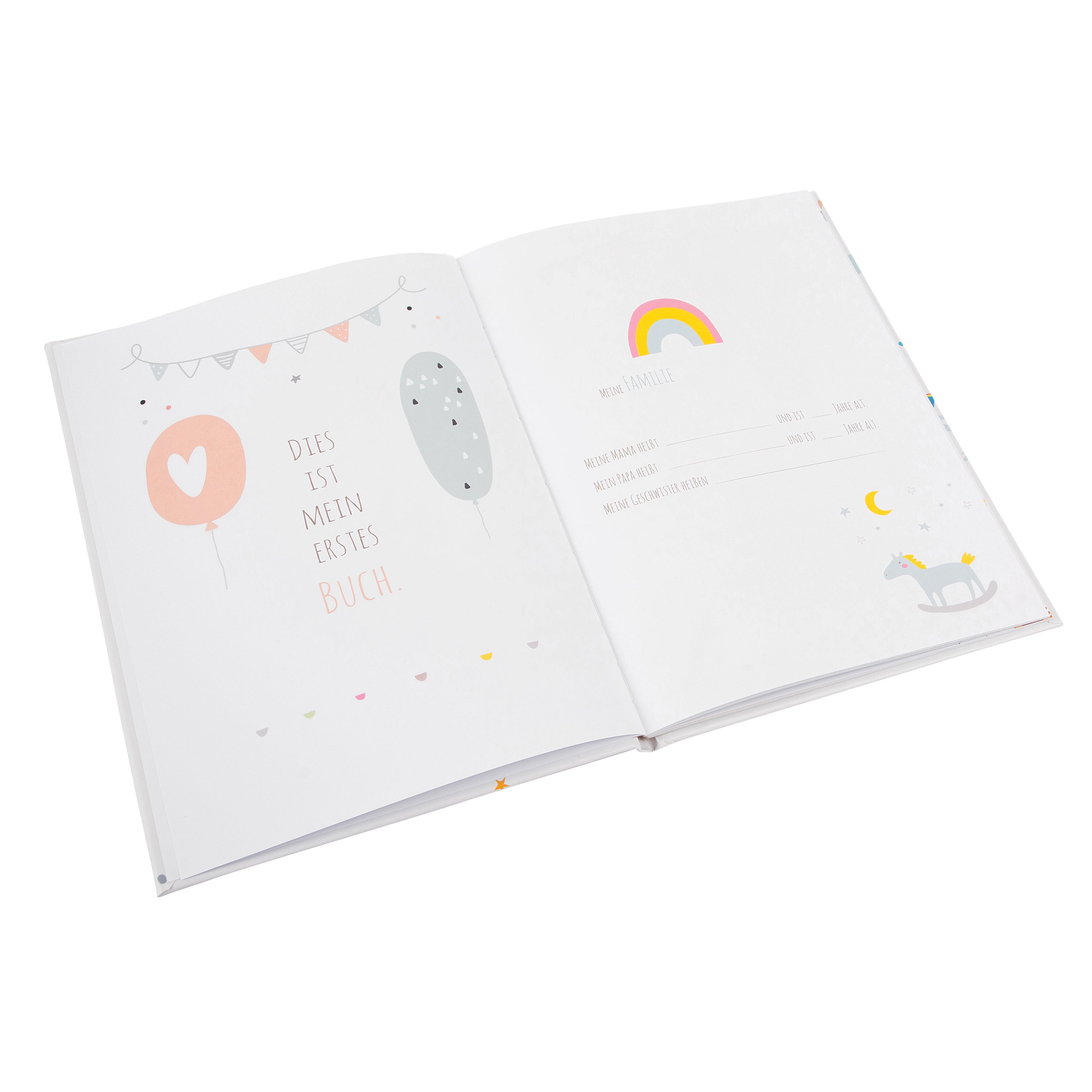 Auf 44 liebevoll gestalteten, illustrierten Seiten im handlichen Format 21 × 28 cm finden frischgebackene Eltern reichlich Platz, um die wertvollsten Erinnerungen festzuhalten – von den ersten Tagen und Wochen bis zu den großen Meilensteinen des ersten Jahres.