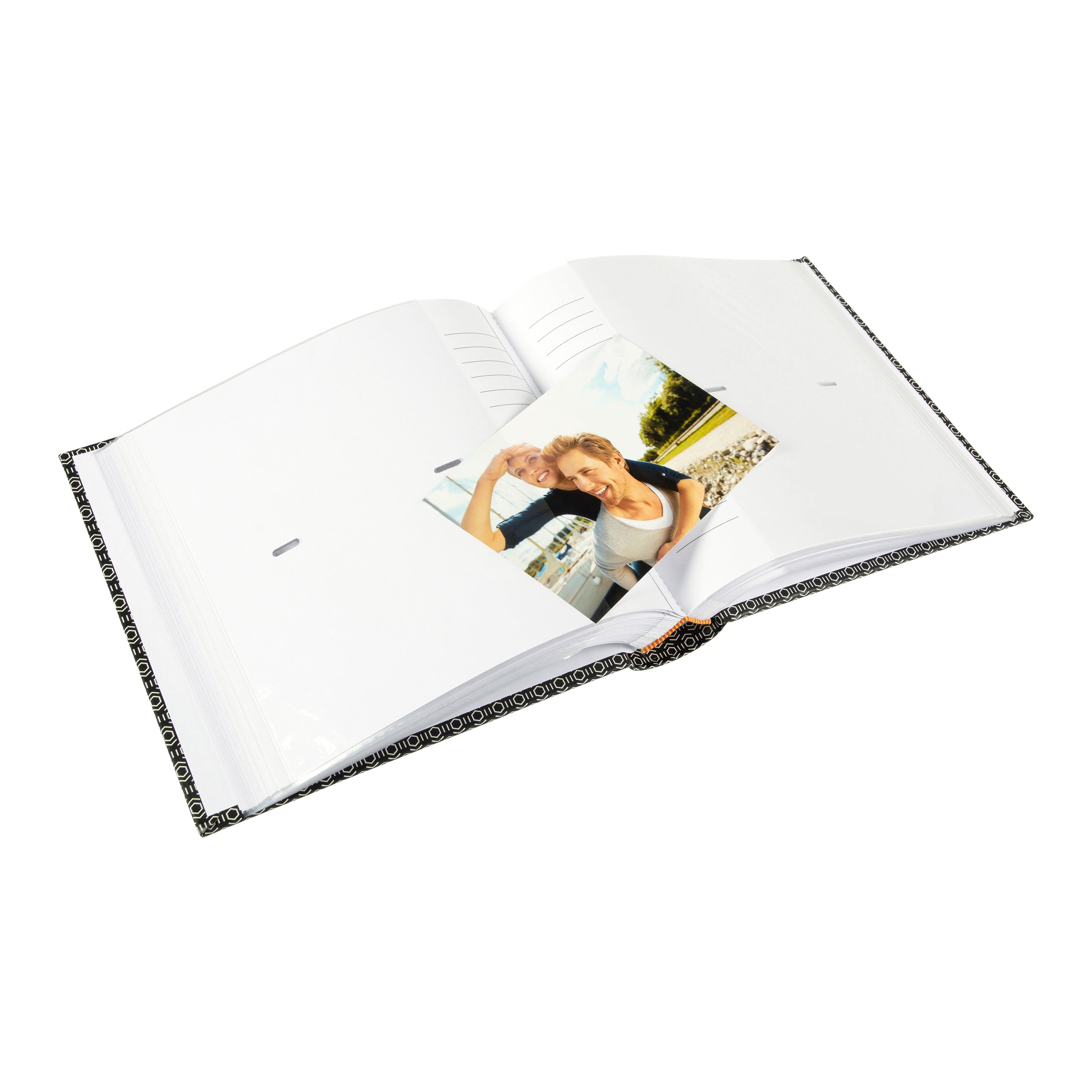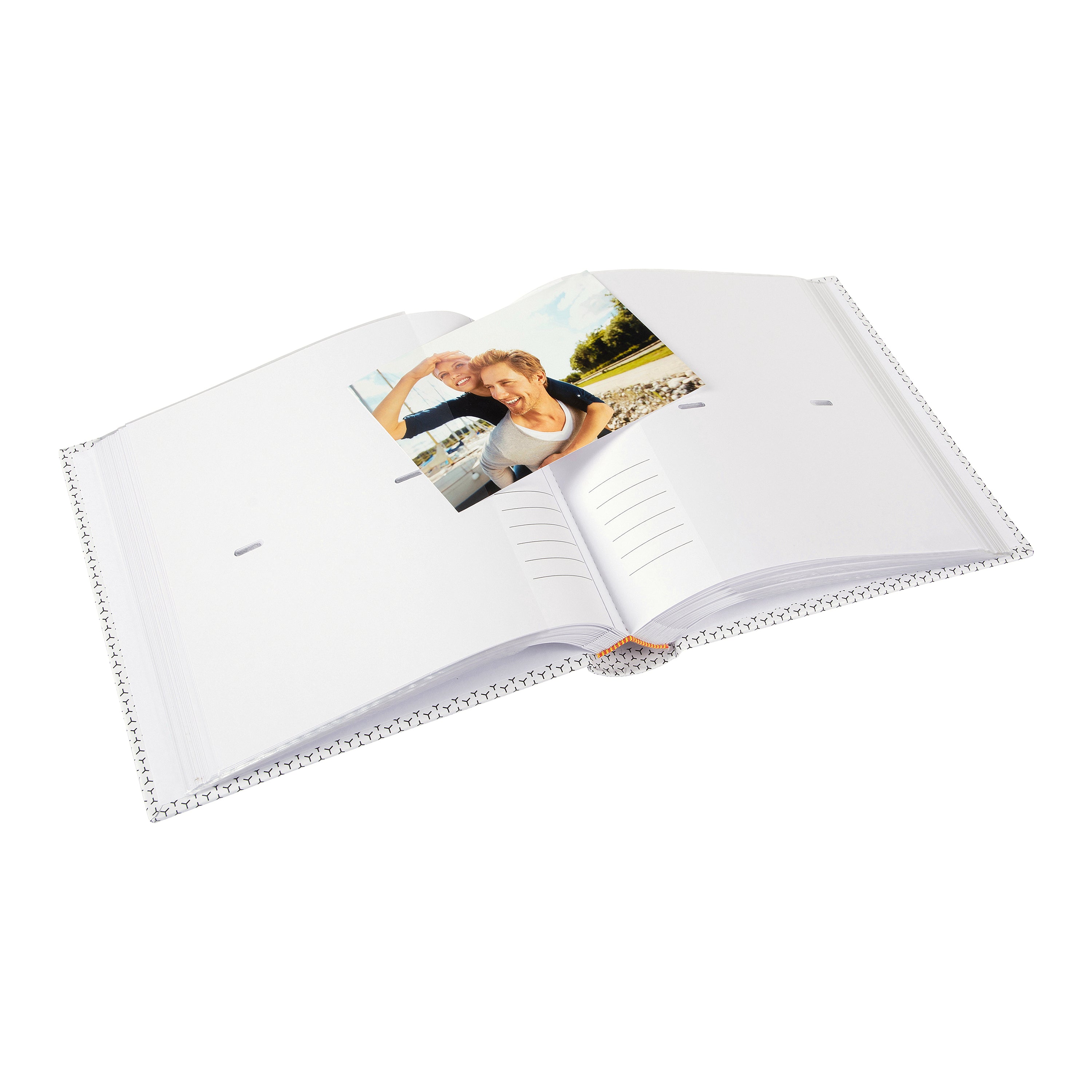 Besonders praktisch: Neben jeder Fototasche befindet sich ein liniertes Notizfeld, in das Sie persönliche Gedanken, Daten oder kleine Geschichten zu Ihren Bildern eintragen können.
