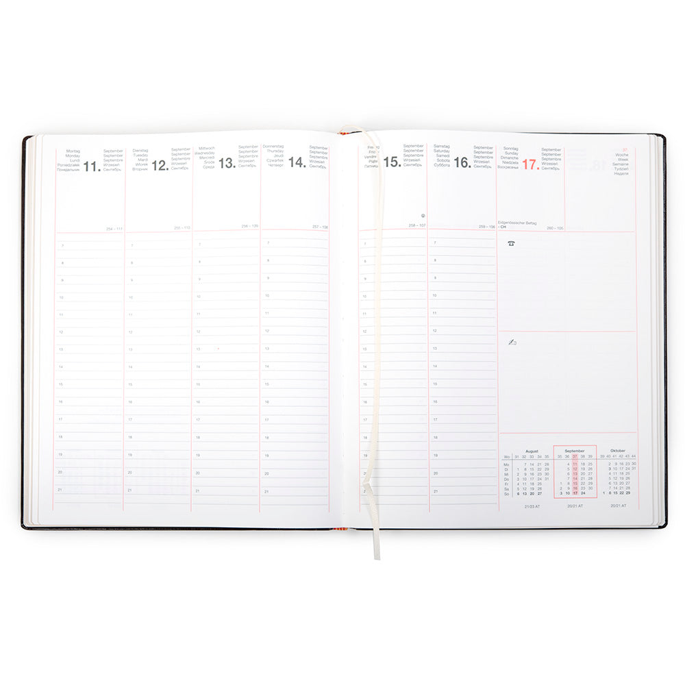 Der handliche Chefkalender Office 2025 von Treuleben & Bischof in 210 x 260 mm bietet auf satinierten 128 Seiten eine optimale Struktur für die Organisation privater und geschäftlicher Termine. Eine Woche ist auf zwei Seiten verteilt, mit je einer Spalte pro Tag, einer stündlichen Auflistung von 7 bis 21 Uhr und ausreichend Platz für Notizen, Telefonnummern, Anrufe und mehr. Jede Seite enthält außerdem eine Miniaturansicht der vorherigen, aktuellen und nächsten Monate.