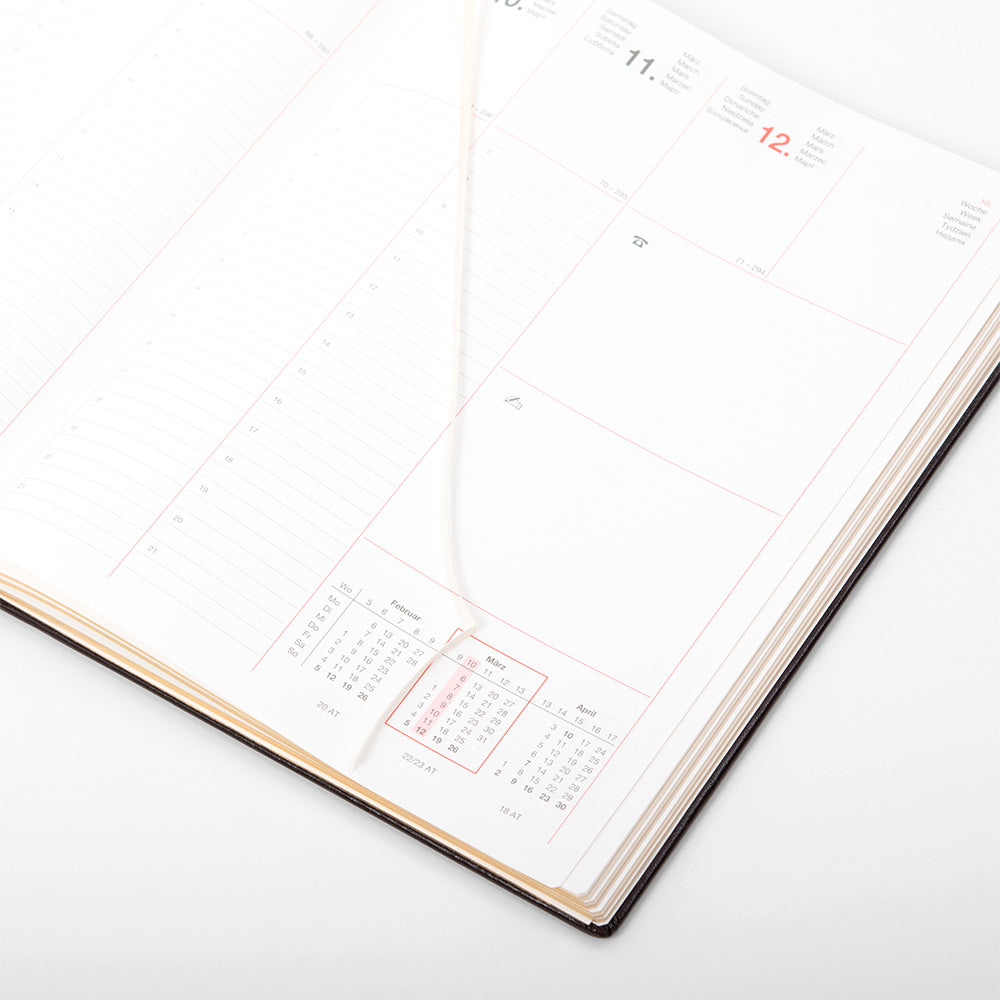 Das Unternehmen Treuleben & Bischof verfügt über mehr als 100 Jahre Erfahrung in der Buchbinderei und Lederverarbeitung. Jedes Bürokalender-Exemplar wird von erfahrenen Meistern handgefertigt und überzeugt durch haptisch angenehme, glatte Echtleder- oder Kunstleder-Einbände, hochwertige Fadenheftung, Lesebändchen und praktische Funktionen wie eine Feiertagsübersicht, Jahresübersicht für 2025 und 2026, internationale Vorwahlen und ein Telefonbuch mit Registern. Die Beschriftungen sind auf Deutsch, Englisch, Französisch und Polnisch verfügbar.