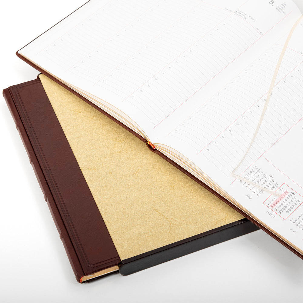 Bei Chefkalender Office in der Luxusausführung erhalten Sie einen Wochenkalender mit Dreiteiler Buchdecke aus Verona Rindvollleder. Dieser beinhaltet elegante Zierbünden am Buchrücken sowie einen von Hand aufgebrachten Silber- oder Goldschnitt am Buchblock. Außerdem wird ein hochwertiger Schuber mitgeliefert, um den Kalender stilvoll zu archivieren. Der Schuber besteht aus marmoriertem Papier mit Lederbezug.