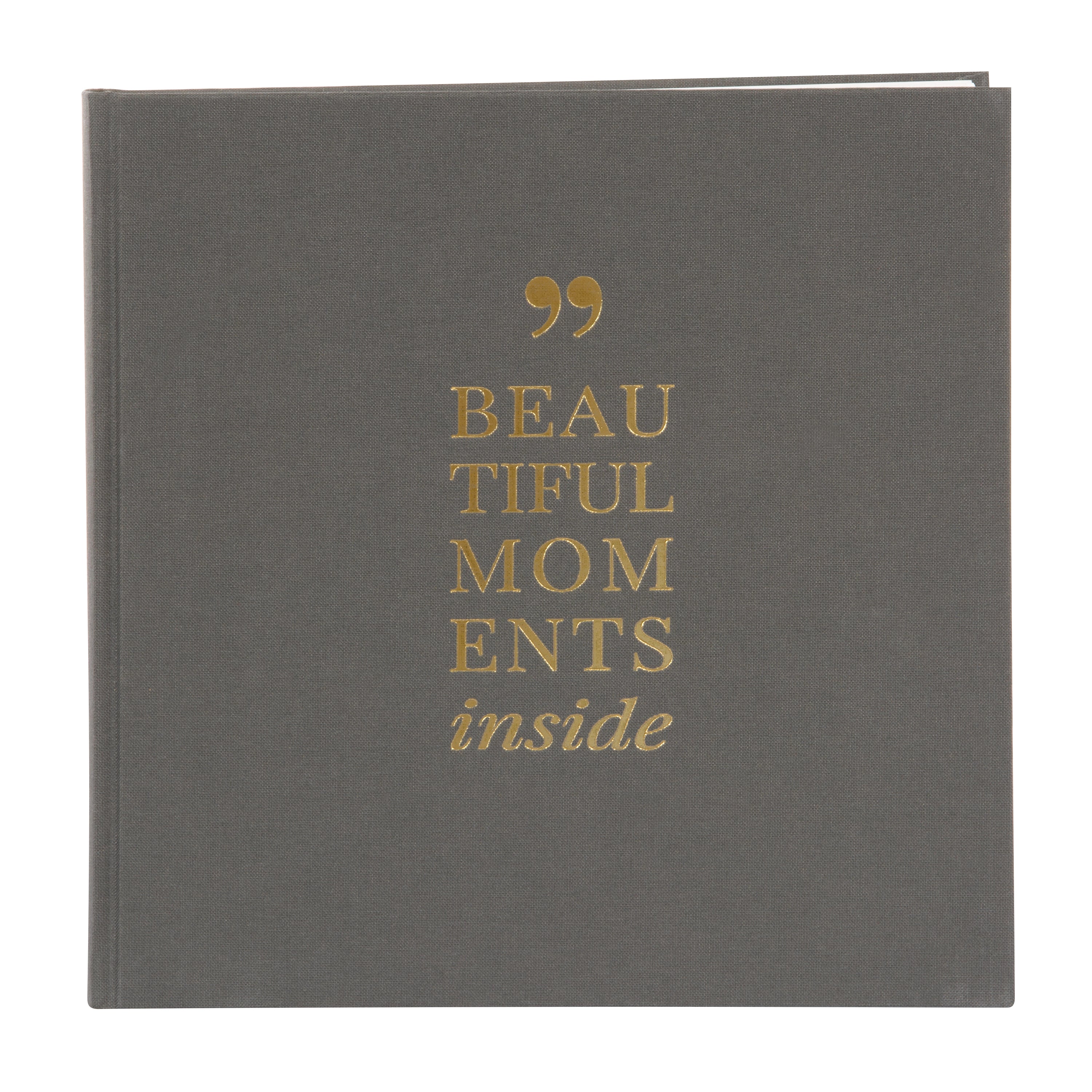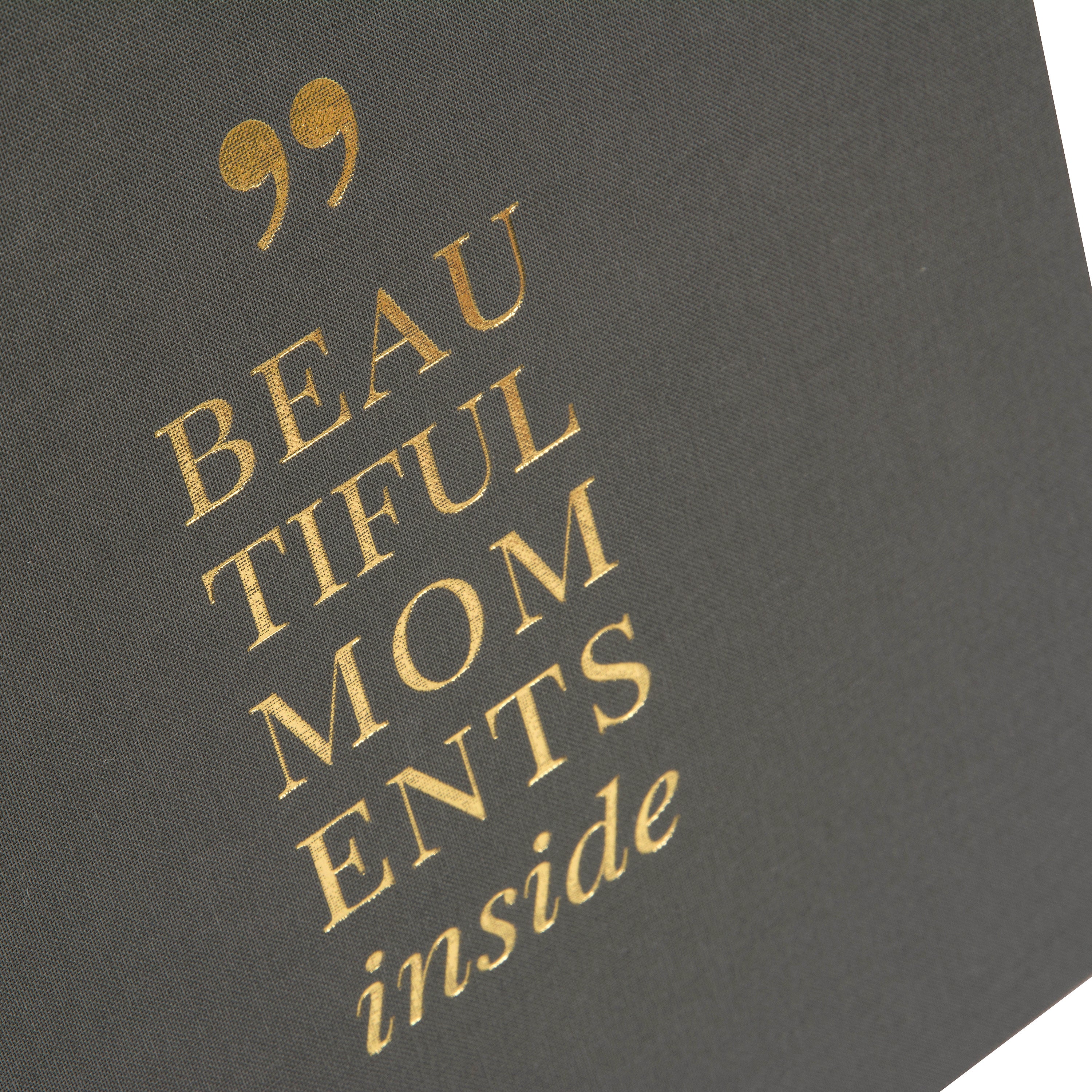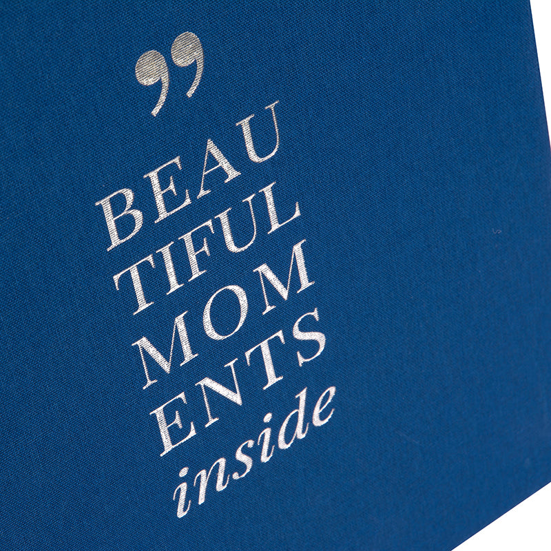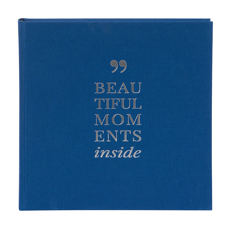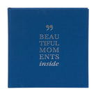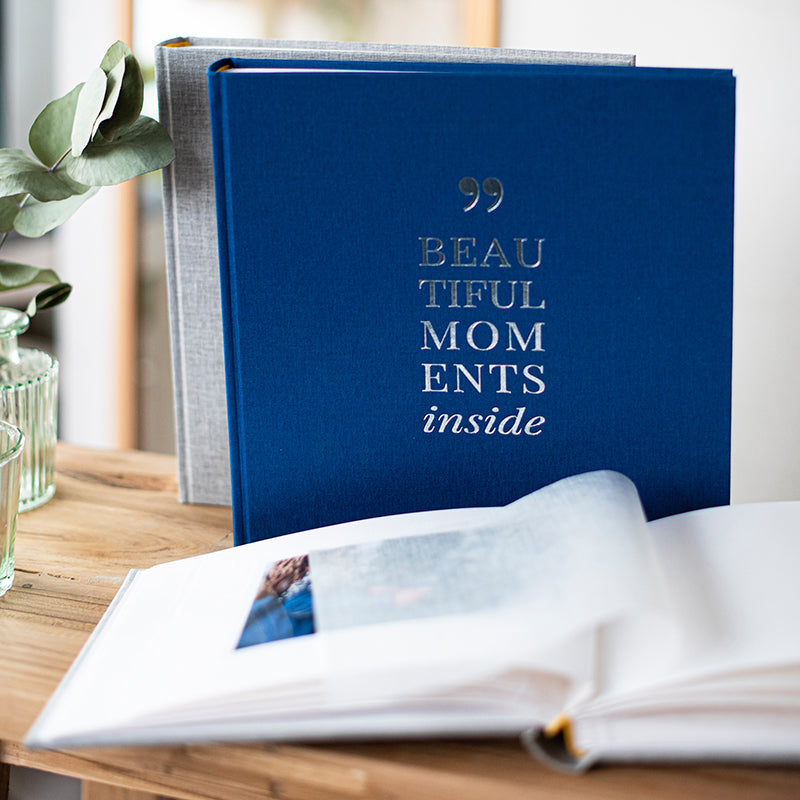 Photo album Linum 2.0 bound as a small photo book with a cover made of high-quality blue linen and 60 white pages made of photo cardboard. With the lettering 'Beautiful Moments inside' embossed on the cover. A photo album in which you can stylishly present the photos of your most beautiful moments in life.