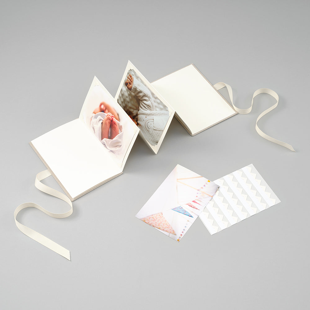 Gefertigt aus feinem Buchleinen und veredelt mit einer aparten Schleife zum Verschließen, verbindet dieses Leporello stilvolles Design mit emotionaler Tiefe. Auf 14 Seiten finden Fotos im Format 10 × 15 cm Platz – ideal für die ersten Babybilder, Taufmomente oder gemeinsame Familienerinnerungen.